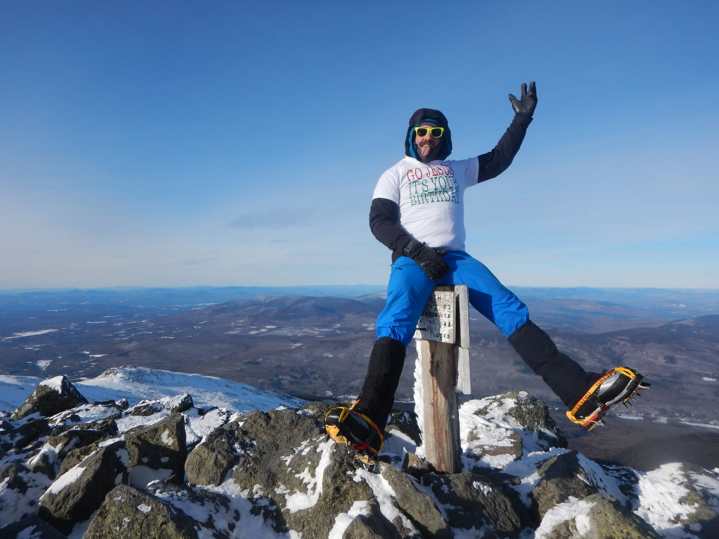 While having some fun photos at the top, I had a "small world" moment, when Nate and Andrew showed up at the peak. I had met these guys during my trip to the Whites in winter of 2017 as we joined up with one other for an 18 mile post-holing session up, over, and down Owl’s Head the day before my Mount Washington summit. Nate and Andrew, ultra-light guys in minimal clothing, stood long enough to take our photos before shooting off to head down. What an incredible moment!