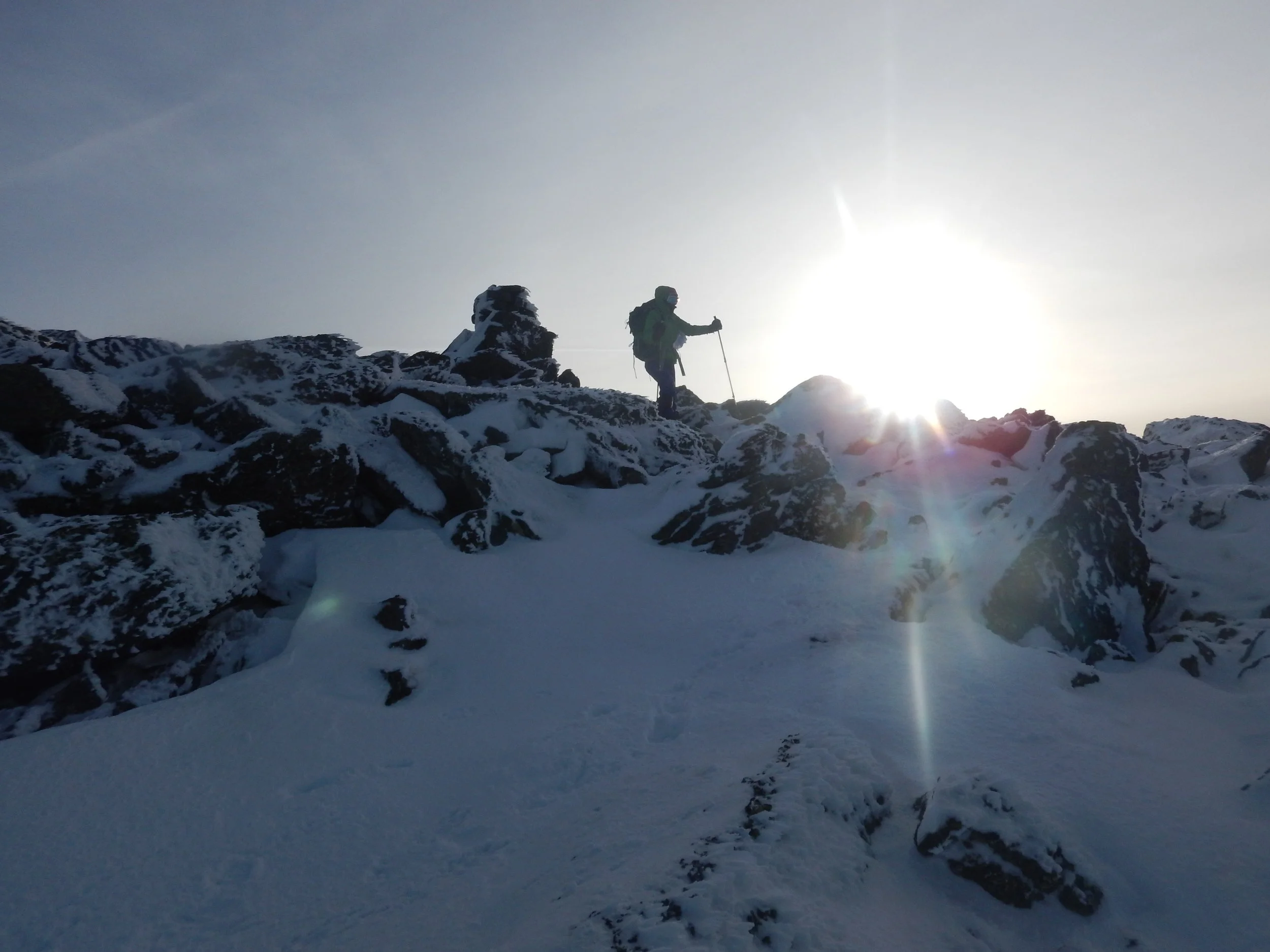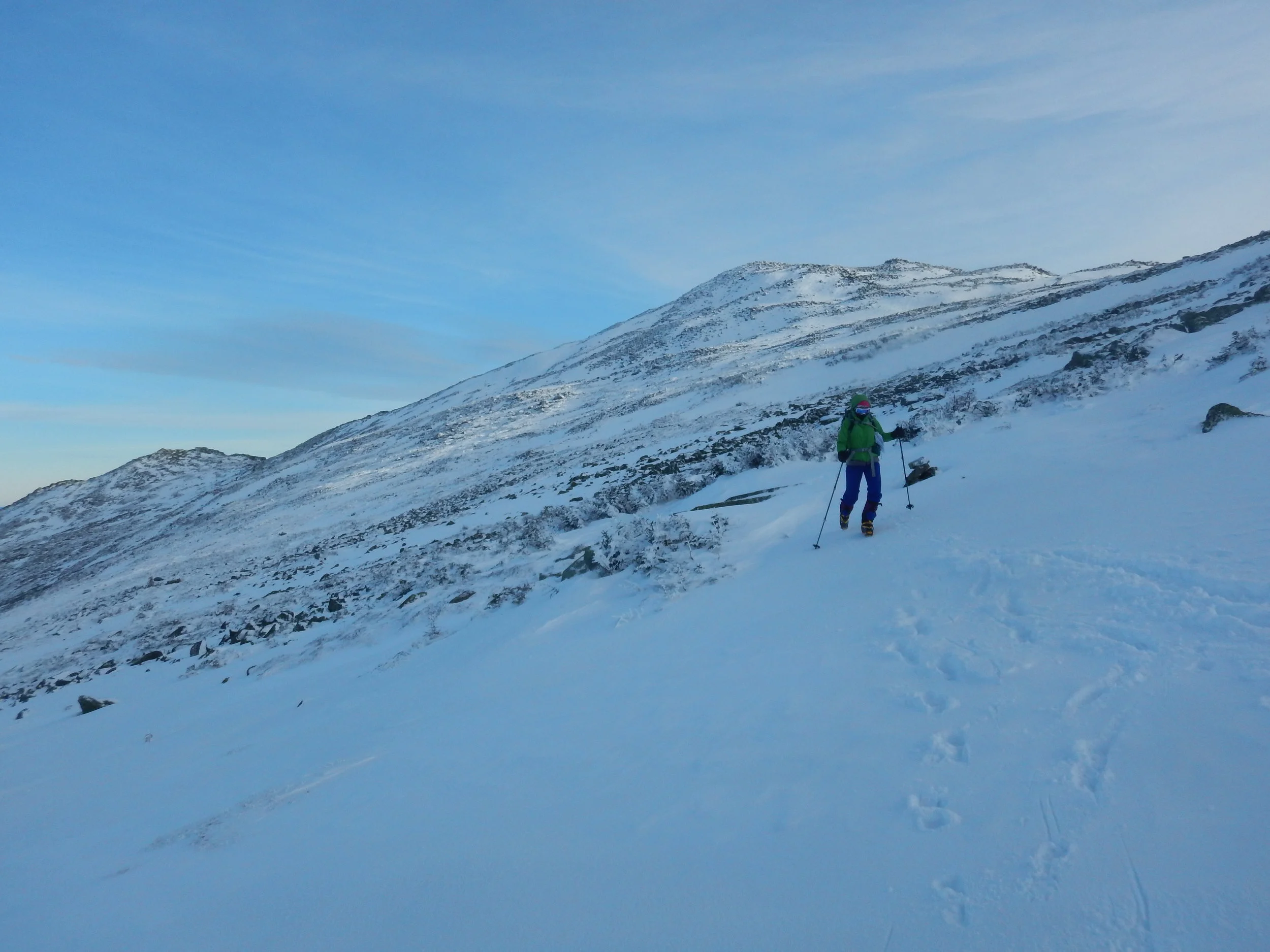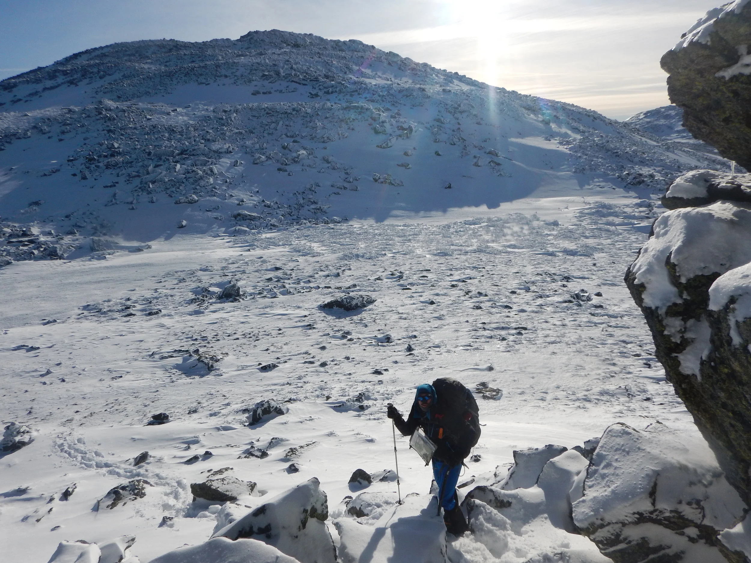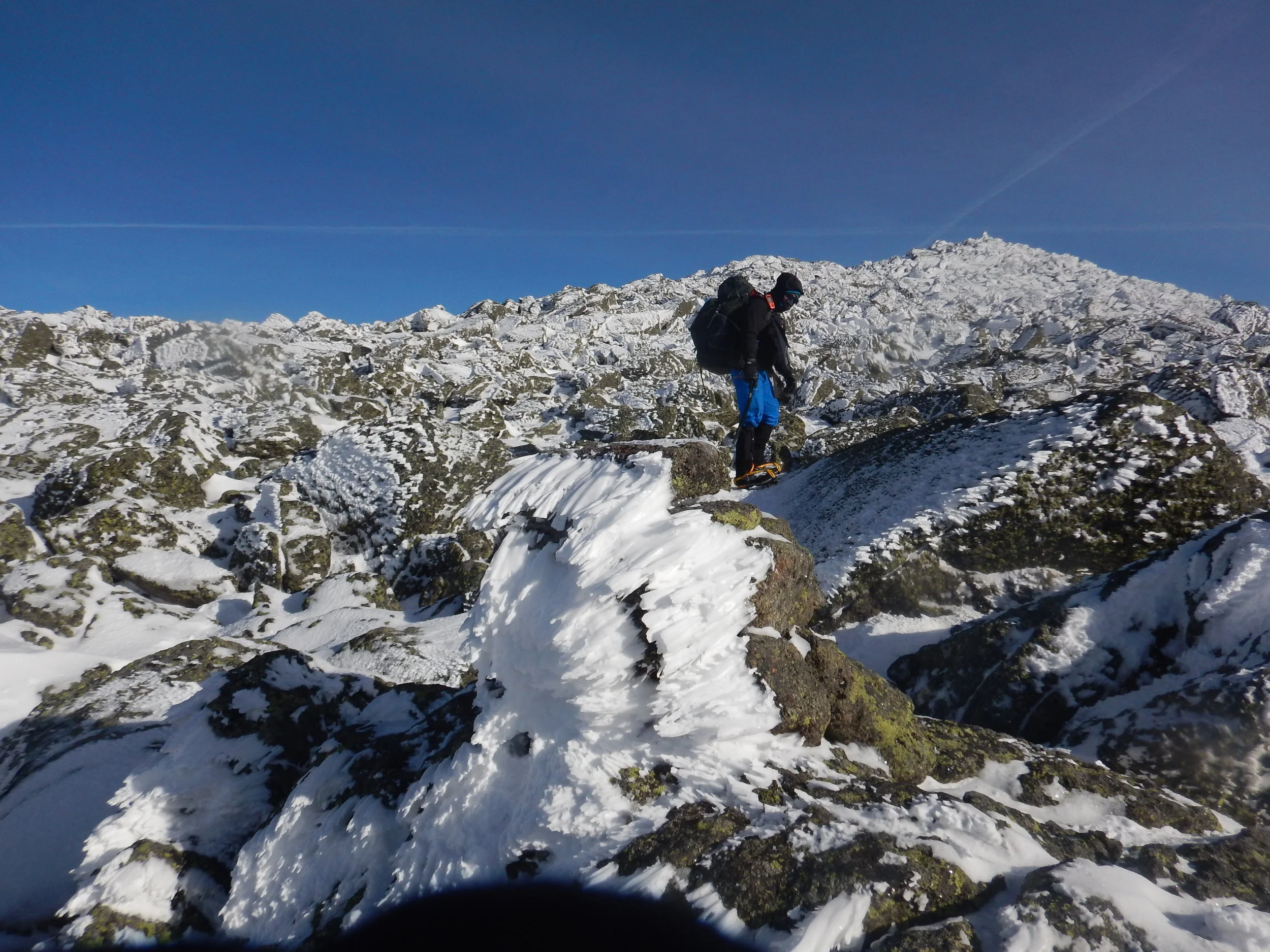 The climb to the top, once above the tree line, was a stark contrast to the prior day. Crampons fixed and on our feet, we made our way confidently across the snow-covered landscape and moved up the rocks towards the peak. This would be Shanna's first encounter with the cold and wind of the Northern Presidentials. What started out as a relatively calm day in terms of weather, now had become a bit more typical winter day with sustained winds of 30mph (bringing the wind chill to -20F). Even still, this is relatively mild for an area that is known for "The Worst Weather in the World". We were clothed for it, and once we had reached the top, spent some time reveling in our success and taking some photos at the summit!